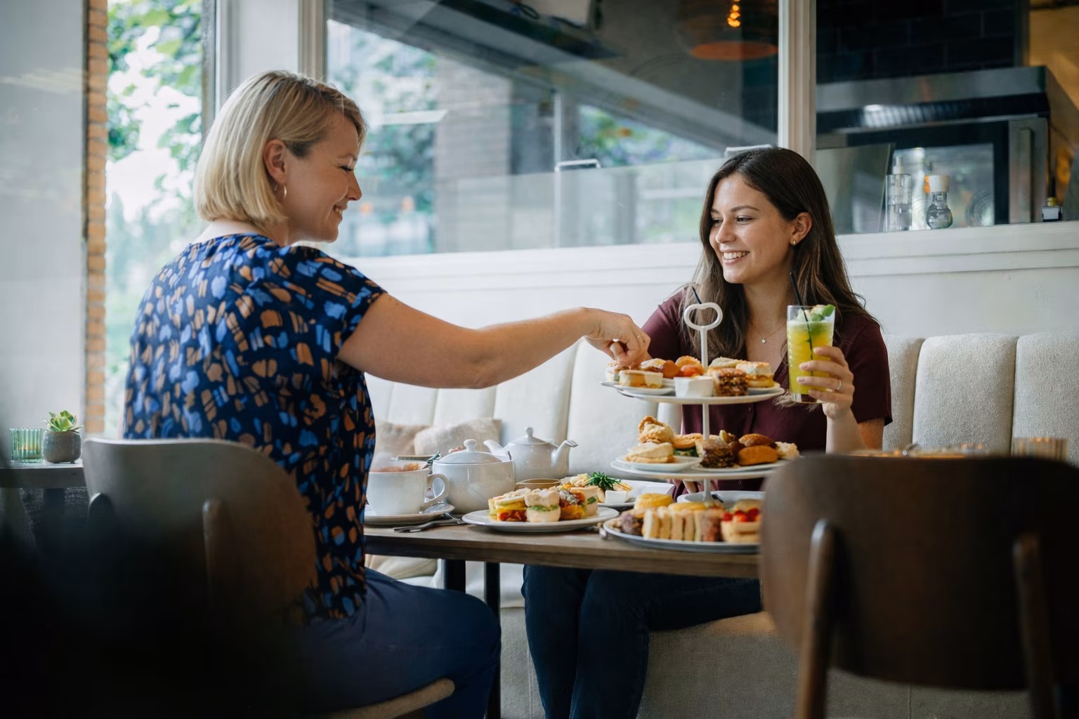 2 dames die genieten van een high tea bij charleys in amersfoort